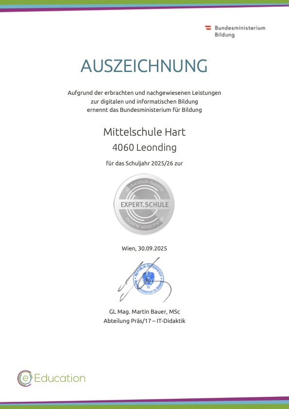 Die Mittelschule Hart wurde dieses Schuljahr wieder als „Expertschule“ ausgezeichnet.